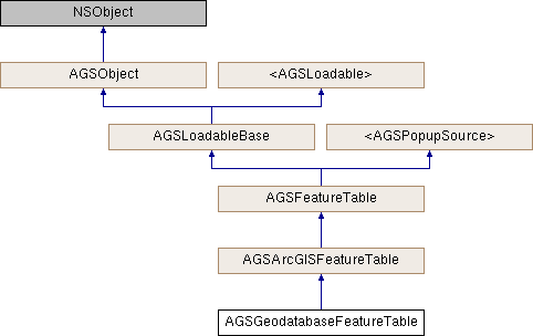 Instances of this class respresent a Geodatabase dataset that could include either geographic features or non-spatial records. You can query the dataset using attribute or spatial criteria, and if permitted, also edit the data. Edits are tracked, so you can later retrieve a list of edits. If the dataset contains geographic features you can display them on a map using AGSFeatureLayer.