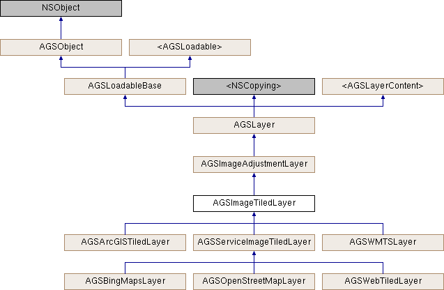 AGSImageTiledLayer defines a base class for layers that display tiled map services and cached image services. This is an abstract class that can be derived in a custom class to implement a local tile data scheme. To implement a custom AGSImageTiledLayer, for example to load your own local tile data, you should derive from this type and supply the data for each tile as it is requested.